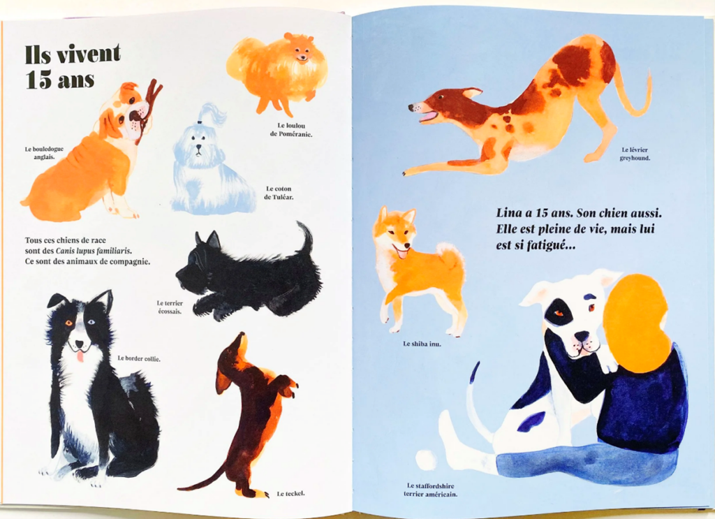 L’exposition met aussi en lumière un second livre de l’illustratrice, Une si longue vie, publié chez La Partie en 2025, qui met en parallèle la durée de vie des animaux face à celle de l’existence humaine. Trois ans, c’est l’espérance de vie d’une hirondelle rustique, mais c’est aussi l’âge auquel la jeune Nina commencera à aller à l’école. Quand son chien fatiguera à l’approche de ses 15 ans, la jeune fille, elle, sera encore en pleine croissance ! À l’inverse, avec un peu de chance, Louise deviendra centenaire, mais une telle longévité n’a rien d’exceptionnelle pour la baleine boréale qui peut atteindre les 200 ans !